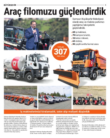 ile yollarımızı, menfezlerimizi, altyapı ve 63 otobüs, 90 çeşitli sınıfta hizmet aracı şehrimizi layık olduğu yere taşımak için Büyükşehir Belediyesi 2022 yılında da 5