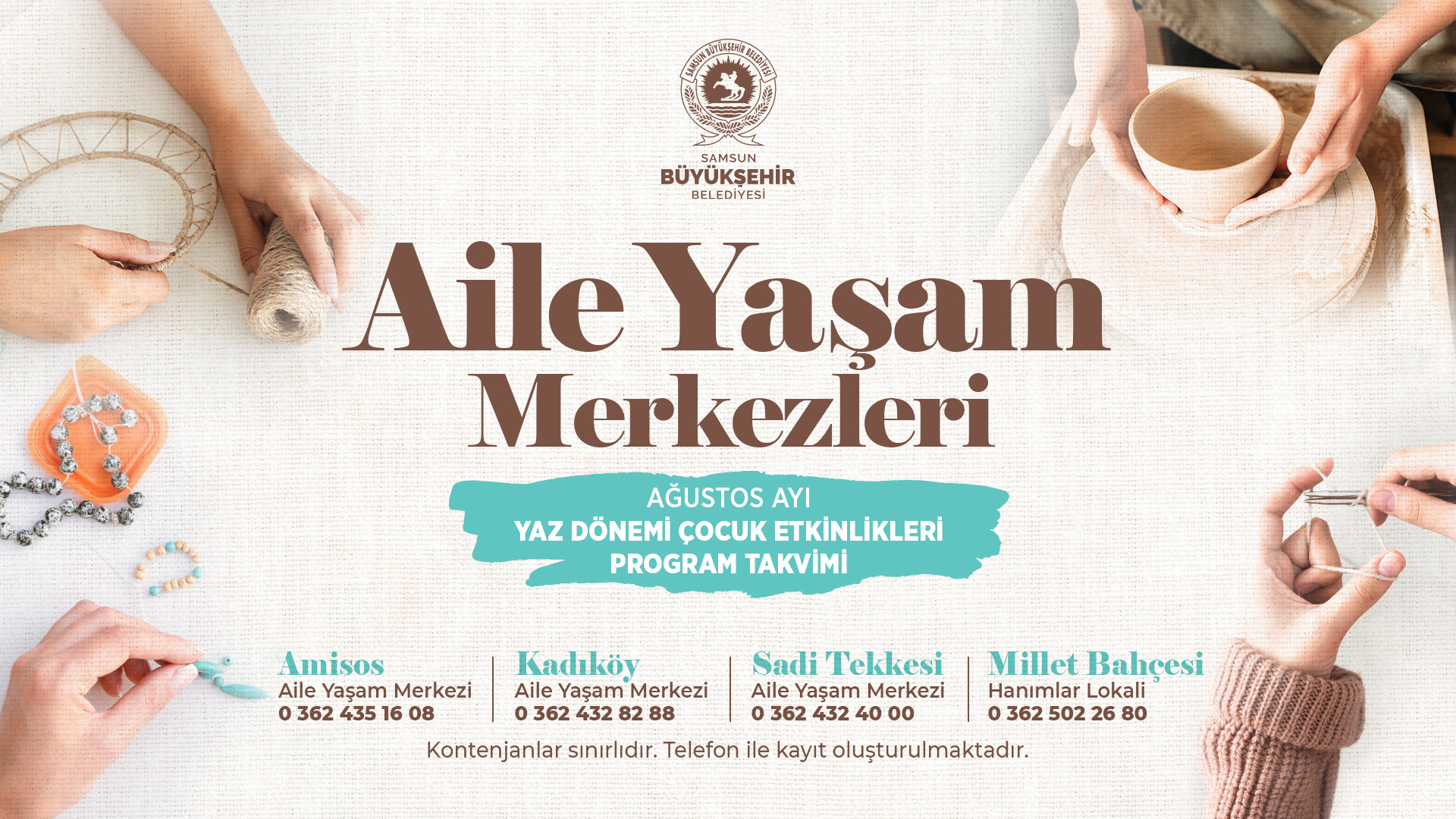Samsun Büyükşehir Belediyesi Aile Yaşam Merkezleri ile çocukların yaz döneminde de hem eğlenceli hem de verimli vakit geçirmesine destek olmaya devam ediyor. Kadıköy Aile Yaşam Merkezi, Amisos Aile Yaşam Merkezi, Sadi Tekkesi Aile Yaşam Merkezi ve Millet Bahçesi Hanımlar Lokali yaz döneminde çocuklar için özel olarak hazırlanan etkinliklerle dolu bir program sunuyor.