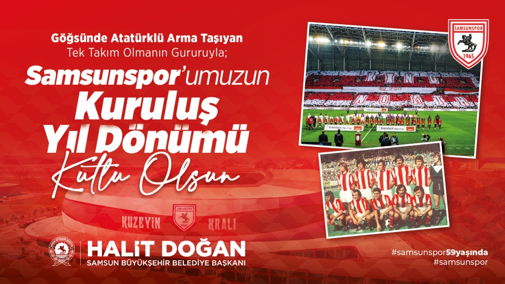 Samsunspor’un daima yanında olarak her türlü desteği vermeye hazır olduğuna vurgu yapan Samsun Büyükşehir Belediye Başkanı Halit Doğan, “Samsunspor’umuz kurulduğu günden bugüne kadar sadece sahada elde ettiği başarılarla değil aynı zamanda şehrimizin ve taraftarlarımızın kalbindeki özel yerle de büyüdü ve güçlendi. Bu nedenle Samsunspor'umuzun başarılı geçmişini ve parlak geleceğini birlikte kutlarken bu büyük ailenin her bir ferdine, taraftarlarımıza, tüm hemşehrilerimize minnettarlığımı da sunmak istiyorum. Şehrimizin ve taraftarlarımızın kalbinde taht kurmuş bu büyük ailenin bir parçası olmaktan dolayı gurur duyuyorum. Samsunspor'umuzun 59. yılını kutlarken, şehrimizin markası, onuru ve gururu olan bu büyük kulübün gelecekte de hepimizin gurur kaynağı olacağına, birlik ve beraberlik içinde Atatürklü armamızı daha da yükseklere taşıyacağımıza inancım tamdır. Şehrimizin takımı Samsunspor'umuzu daima destekleyeceğimi ve yanında olacağımı bir kez daha yürekten ifade etmek istiyorum” ifadelerine yer verdi.