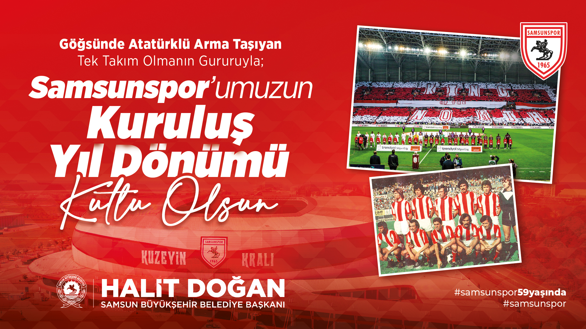 Samsun Büyükşehir Belediye Başkanı Halit Doğan, Samsunspor’un 59’uncu kuruluş yıl dönümünü kutladı. Başkan Doğan, “Samsunspor'umuzun 59. kuruluş yıl dönümünü gururla ve sevinçle kutlamanın büyük mutluluğunu yaşıyorum. 59 yıl önce bu şehrin topraklarında doğan ve sadece bir futbol kulübü değil aynı zamanda Samsun'umuzun simgesi, onuru ve gururu haline gelen Samsunspor’umuz, şehrimizin ve tüm Karadeniz'in ortak sevinci olmuştur” ifadelerini kullandı.