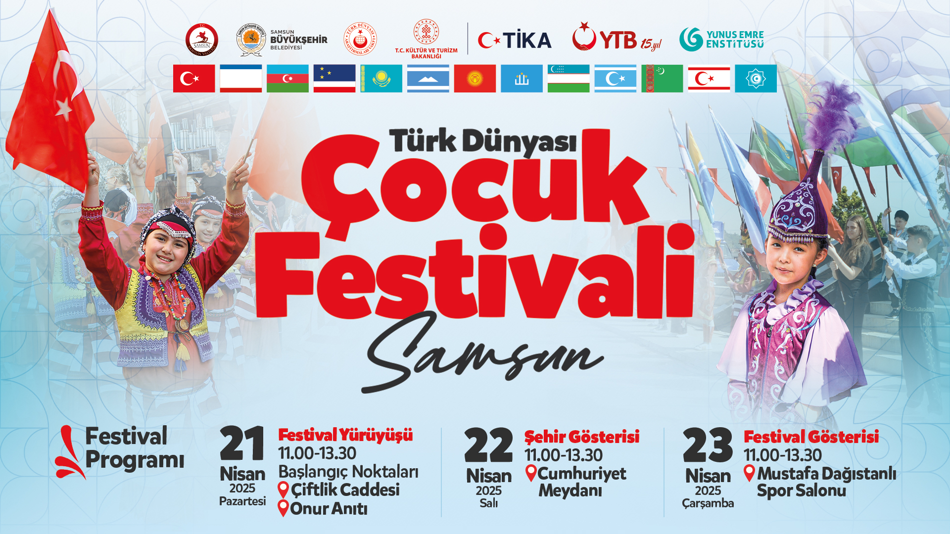 Samsun Büyükşehir Belediyesi kültür ve sanat şehri Samsun’da Türk Dünyası Çocuklarını, Türk Dünyası Çocuk Festivali’nde buluşturuyor. Samsun Büyükşehir Belediyesi’nin ev sahipliğinde, Türkiye Cumhuriyeti Kültür ve Turizm Bakanlığı, Samsun Valiliği, Türk Dünyası Araştırma Vakfı, TİKA, YTB ve Yunus Emre Enstitüsü'nün iş birliğiyle düzenlenen festivalde Türk Dünyası'nın dokuz farklı ülkesinden toplam 124 katılımcı yer alacak. 21-22-23 Nisan tarihleri arasında gerçekleştirilecek bu kültürel buluşma renkli etkinliklerle zenginleşecek.