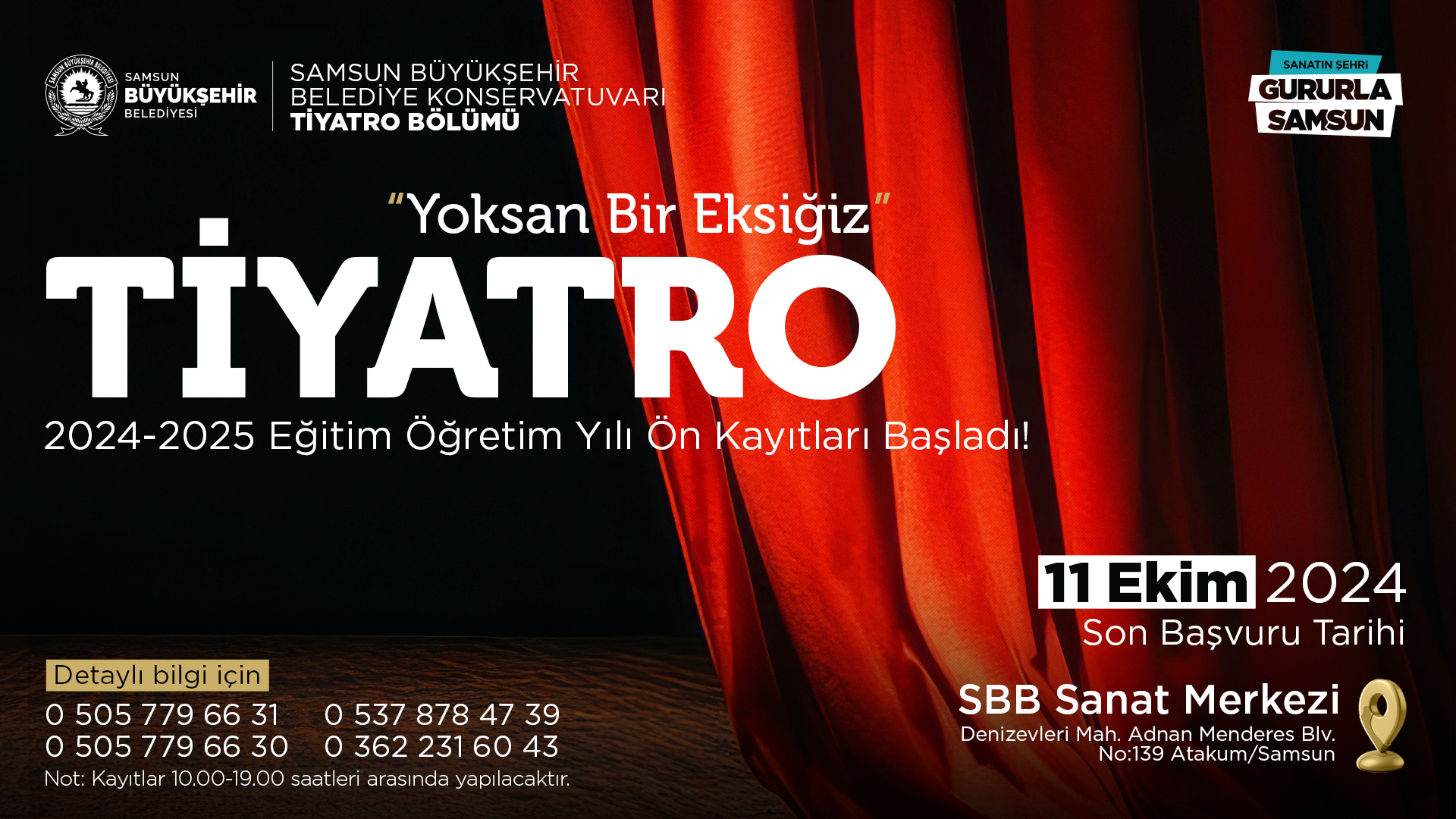 Her yaştan insanın hayatına dokunan, şehrin kültürel ve sosyal hayatına ışık tutan Samsun Büyükşehir Belediyesi’nin, Belediye Konservatuarı yeni dönem Tiyatro Kurslarına kayıtlar başladı. 8-13 yaş arası çocuklar ve 14 yaş üstü için de ayrı programlar sunan kursların son başvuru tarihi 11 Ekim olarak belirlendi. Düzenlenecek kurslara kayıt olmak isteyen adaylar müracaatlarını Atakum Sanat Merkezi’nden yapabilecek. Başvuru yapmak isteyenler detaylı bilgiye ise 05057796631, 05057796630, 05378784739, 03622316043 numaralı telefonlardan ulaşabilecekler.