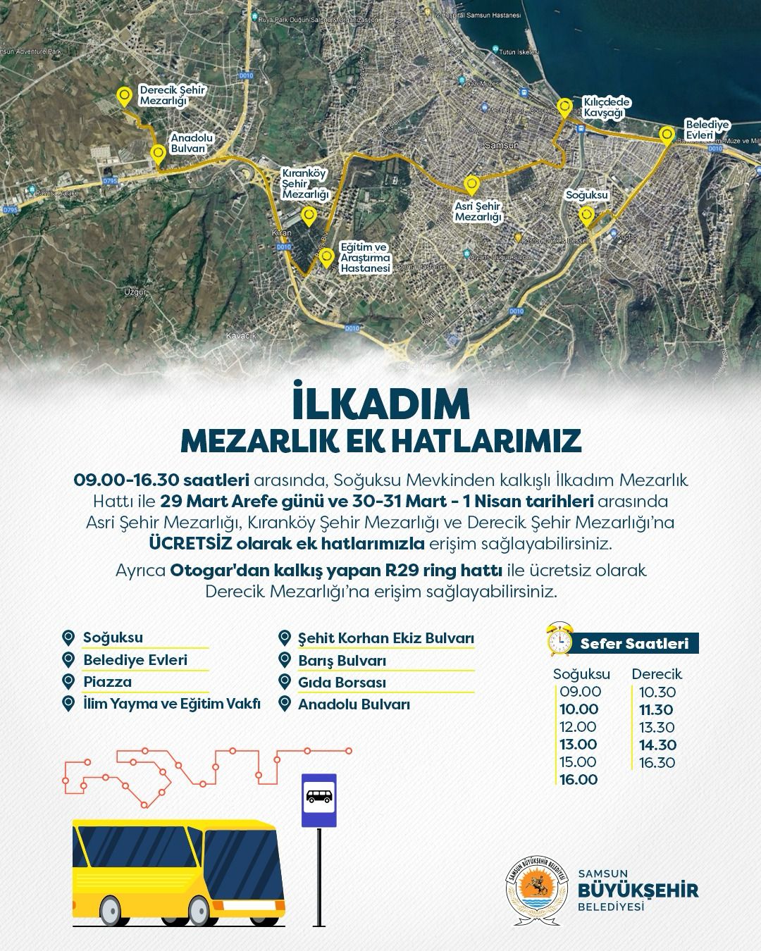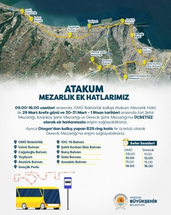 Ayrıca Büyükşehir Belediyesi tarafından vatandaşların mezarlık ziyaretlerini rahat bir şekilde yapabilmeleri adına ek hatlarla ulaşım sağlanacak. 29 Mart Arefe günü ve 30-31 Mart ve 1 Nisan tarihlerinde, Asri Şehir Mezarlığı, Kıranköy Şehir Mezarlığı ve Derecik Şehir Mezarlığı’na Soğuksu’dan Kalkan İlkadım Mezarlık Ek Hattı ve OMÜ Rektörlükten kalkan Atakum Mezarlık Ek Hattı’nın güzergâhlarına göre ücretsiz ulaşım imkânı sağlanacak. Hali hazırda bulunan R29 Ring Hattı ise Derecik Mezarlığı’na ücretsiz ulaşım imkanı sağlamaya devam edecek. Vatandaşlar detaylı güzergâh bilgisi ve diğer ulaşım hizmetleriyle ilgili bilgilere Samsun Büyükşehir Belediyesi'nin resmi internet sitesinden veya iletişim kanallarından ulaşabilecek.