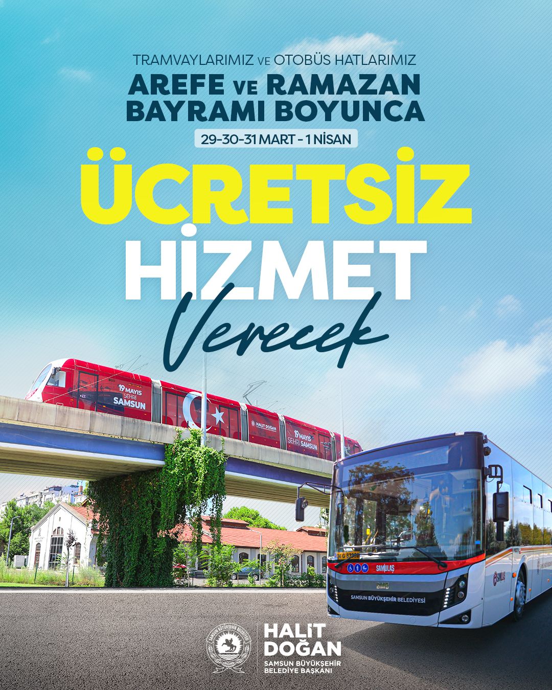 Samsun Büyükşehir Belediye Başkanı Halit Doğan, “Hemşehrilerimizin bu güzel bayramı huzur içinde, gönüllerince geçirebilmesi bizler için çok kıymetli. Bu anlamda bayramı daha da özel kılabilmek adına bayram boyunca ulaşımı tamamen ücretsiz hale getirdik. Ulaşım desteğimizle birlikte hemşehrilerimizin hiçbir engel olmadan sevdiklerine kolayca ulaşabilmesini sağlayarak mutlu bir bayram geçirmesini temenni ediyorum. Bu vesileyle tüm hemşehrilerimizin Ramazan Bayramı’nı en içten dileklerimle kutluyor, ailelerimizle ve sevdiklerimizle birlikte sağlıklı ve huzurlu bir bayram geçirmemizi temenni ediyorum” dedi.