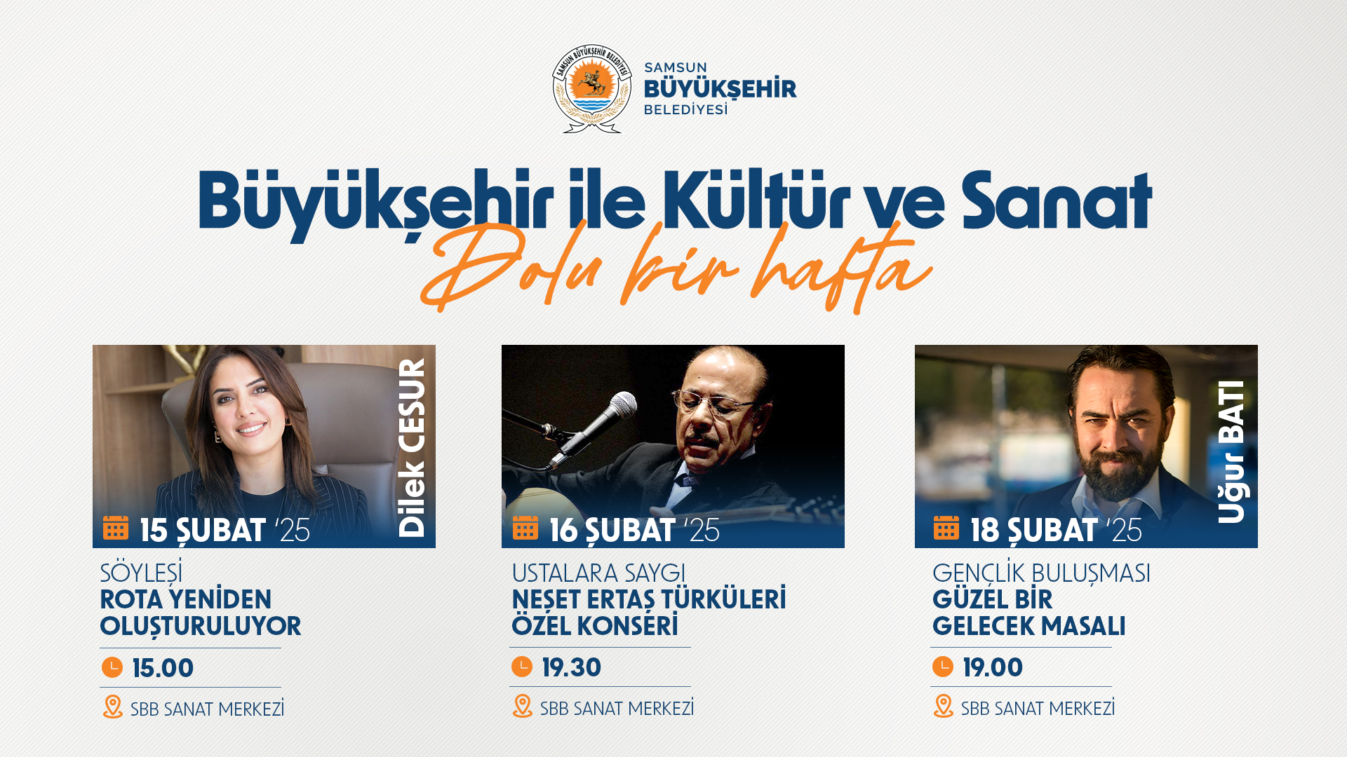 Samsunlular, Büyükşehir Belediyesi ile kültür ve sanat dolu bir hafta geçirecek. SBB Sanat Merkezi’nde gerçekleşecek programlarda ilk olarak 15 Şubat Cumartesi 15.00’te Aile Danışmanı ve Eğitimci-Yazar Dilek Cesur “Rota Yeniden Oluşturuluyor” adlı söyleşi ile sevenleri ile buluşacak. 16 Şubat Pazar 19.30’da ise yüzlerce eseriyle gönüllerde yer eden, Bozkırın Tezenesi olarak bilinen büyük usta Neşet Ertaş anısına “Ustalara Saygı” başlığı ile konser düzenlenecek. Haftanın diğer programında ise İletişim Bilimci ve Yazar Uğur Batu, 18 Şubat Salı günü saat 19.00’da “Güzel Bir Gelecek” söyleşisinde Samsunlularla bir araya gelecek.