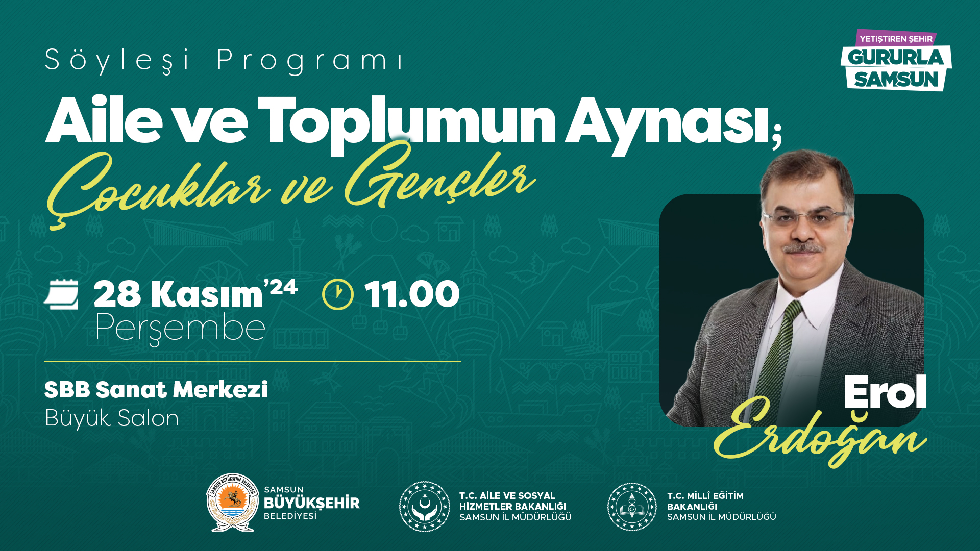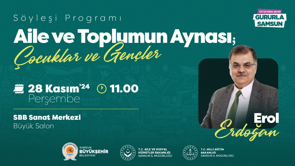 Samsun Büyükşehir Belediyesi’nin organizasyonu; Samsun Aile ve Sosyal Hizmetler İl Müdürlüğü ve Samsun Milli Eğitim İl Müdürlüğünün desteğiyle düzenlenen programla ünlü yazar Erol Erdoğan, 28 Kasım Perşembe günü (yarın) Samsunlu vatandaşlarla buluşacak. Saat 11.00’de Samsun Büyükşehir Belediyesi Sanat Merkezi Büyük Salon’da gerçekleşecek olan “Aile ve Toplumun Aynası, Çocuklar ve Gençler” konulu konferans ailelerin toplum yapısındaki yerini ve çocuklar ile gençlerin geleceğe olan etkisini ele alacak.