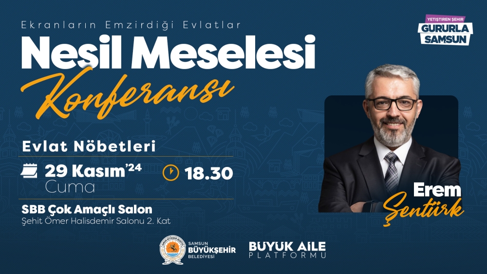 Samsun Büyükşehir Belediyesi düzenlediği bir dizi etkinlik ve kültürel faaliyetlerle vatandaşlarla bir araya gelmeyi sürdürüyor. Vatandaşların yoğun katılım gösterdiği programlar hem bilgi edinmelerine hem de hoş vakit geçirmelerine olanak tanıyor. Bu kapsamda Büyükşehir Belediyesi ve Büyük Aile Platformu iş birliğinde “Ekranların Emzirdiği Evlatlar Nesil Meselesi” konulu konferansı ile Gazeteci-Yazar Erem Şentürk Samsunlu vatandaşlarla buluşuyor.