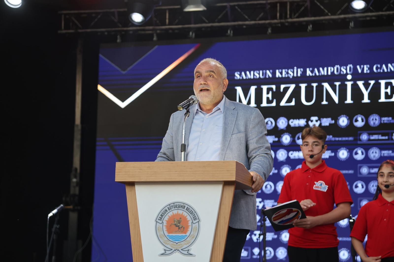 Samsun Büyükşehir Belediye Başkanı Halit Doğan ise Keşif Kampüslerinin ilk mezuniyet töreninin tarihi bir başlangıç olduğunu belirtti: “Bugün burada yalnızca bir mezuniyet töreni gerçekleştirmiyoruz; aynı zamanda bir vizyonun hayat buluşuna tanıklık ediyoruz. Sizler bu yolun öncülerisiniz. İlk mezunlar olarak Samsun’un tarihine adınızı yazdırıyorsunuz. Hayal ettikçe şehrimiz ve ülkemiz yükselecek. Tıpkı drone takımlarımızın Teknofest’te elde ettiği başarı gibi, sizler de ulusal ve uluslararası arenalarda Samsun’umuzun adını gururla temsil edeceksiniz. Türkiye Yüzyılı vizyonu, siz gençlerin attığı bu adımlarla şekillenecek. Bilim ve teknoloji yolculuğunuzda hep yanınızda olacağız” diye konuştu.