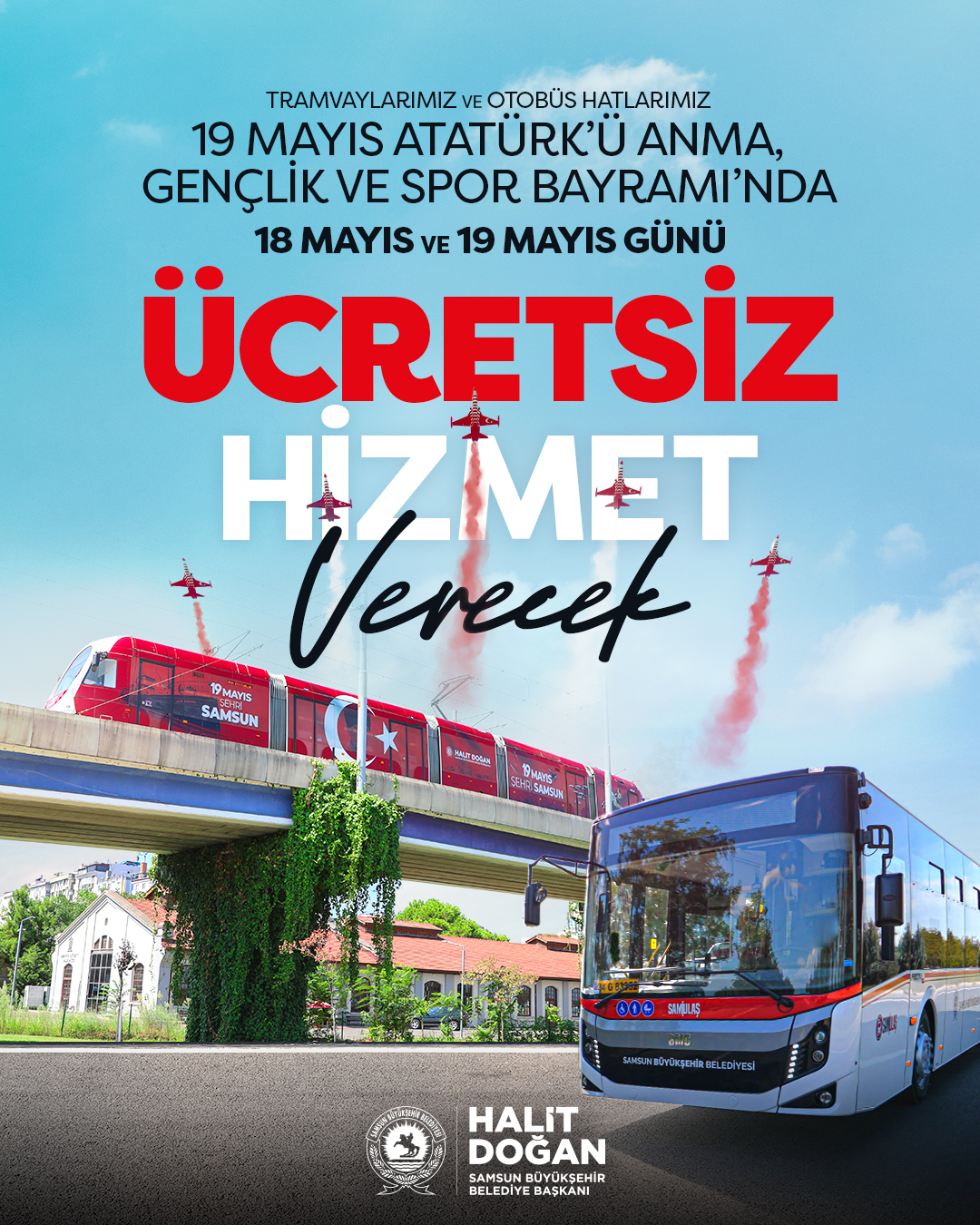19 Mayıs ruhunu tüm kente yaymak için harekete geçen Samsun Büyükşehir Belediyesi şehir genelinde 35 noktada, cadde, sokak ve tramvaylarda “Ya İstiklal Ya Ölüm” tiyatro oyununu vatandaşlarla buluşturuyor. 19 Mayıs şehri Samsun’da bayram coşkusunu doyasıya yaşadıklarını belirten Samsun Büyükşehir Belediye Başkanı Halit Doğan, tüm vatandaşları 19 Mayıs kutlamalarına davet etti. Ayrıca Büyükşehir Belediyesi tarafından 19 Mayıs Atatürk’ü Anma, Gençlik ve Spor Bayramı kutlamaları kapsamında belediye tesislerinde 19 Mayıs gününe özel yüzde 19 indirim sağlanırken 18 ve 19 Mayıs tarihlerinde de şehirde otobüs ve tramvaylar ücretsiz hale getirildi.