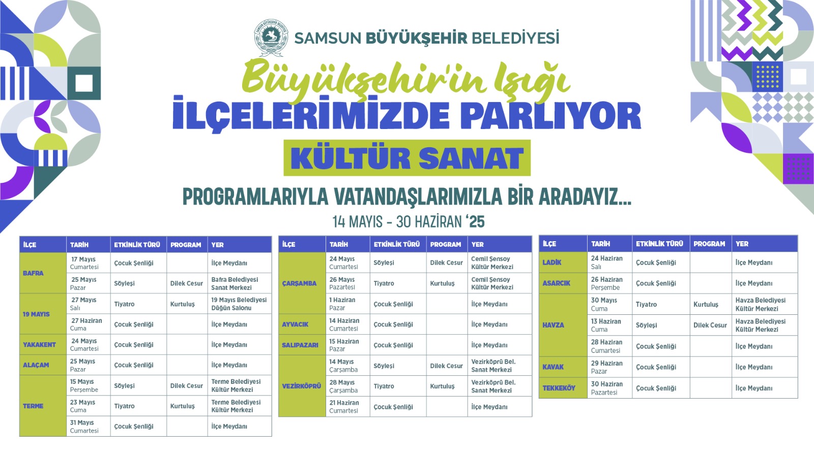 Samsun Büyükşehir Belediyesi ile kültür ve sanatın kalbi Samsun’da atmaya devam ediyor. Büyükşehir Belediyesi kültür sanat faaliyetlerini ilçelere yayıyor. 14 Mayıs Çarşamba günü başlayacak kültür-sanat şöleni 30 Haziran’a kadar devam edecek. Samsun’un kültür-sanat zenginliğini ilçelere taşımak; her yaştan vatandaşın sanat ve eğlenceyle buluşmasını sağlamak amacı ile düzenlenen program, ilk olarak 14 Mayıs Çarşamba günü Vezirköprü ilçesi ile start alacak.