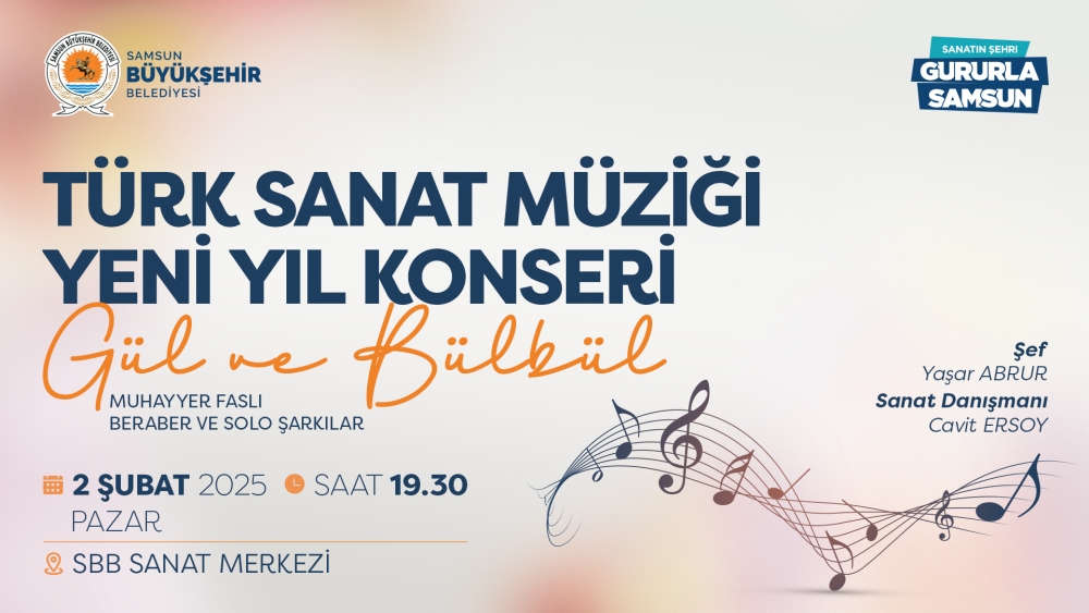 Samsun Büyükşehir Belediyesi, Türk Sanat Müziği’ne gönül veren herkesi katılımın tamamen ücretsiz olduğu Türk Sanat Müziği Yeni Yıl Konserine davet ediyor.