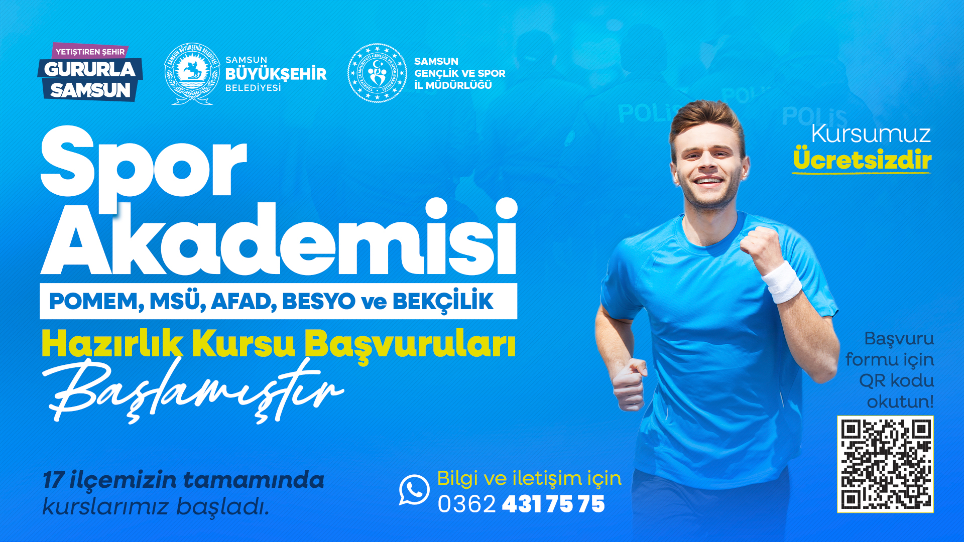 Samsun Büyükşehir Belediyesi ve Samsun Gençlik ve Spor İl Müdürlüğü iş birliği ile hayata geçirilen Spor Akademisi Hazırlık Kursları ile gençler hayallerine bir adım daha yaklaşıyor. Spor Akademisinde gençler; POMEM (Polis Meslek Eğitim Merkezi), MSÜ (Milli Savunma Üniversitesi), AFAD (İl Afet ve Acil Durum Müdürlüğü), BESYO (Beden Eğitimi ve Spor Yüksekokulu) ve Bekçilik kurslarına katılıp sınavlara hazırlanabilecekler.