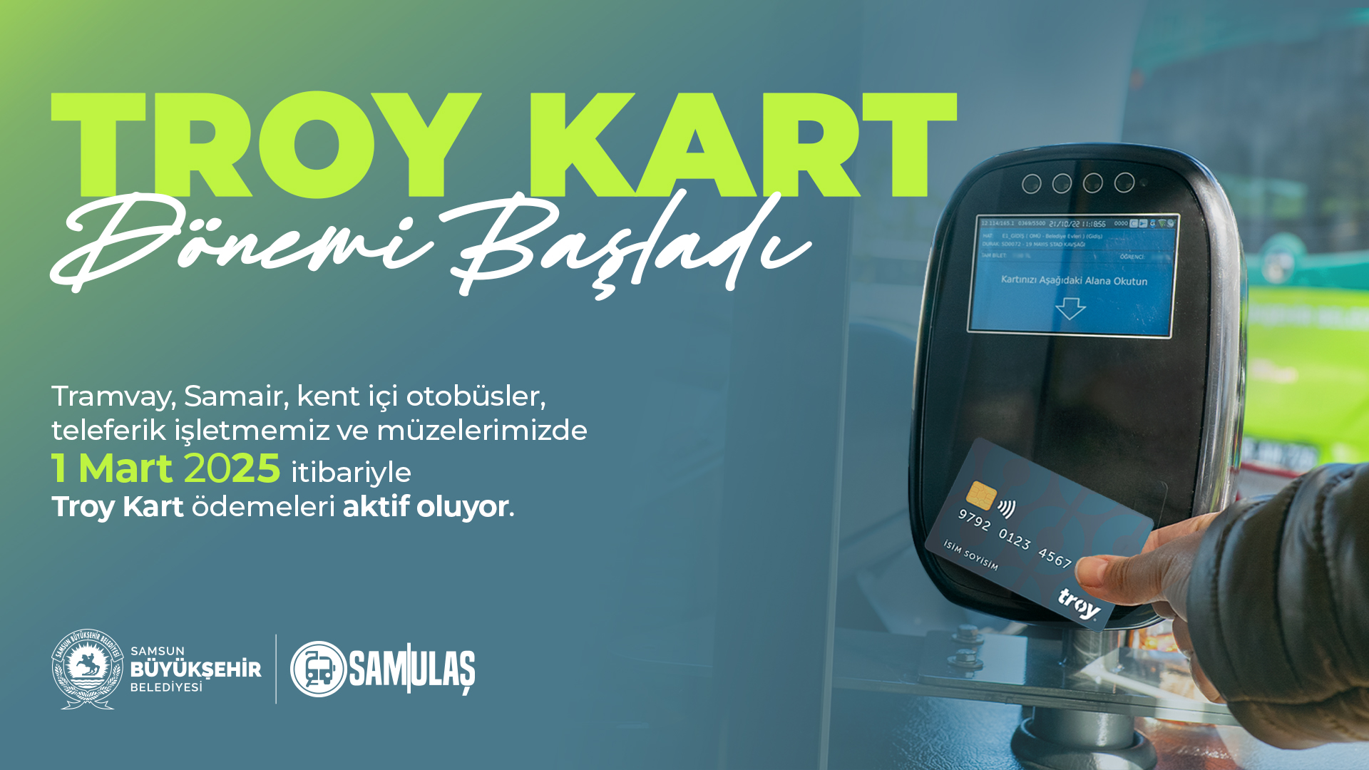Samsun Büyükşehir Belediyesi, yaptığı her hizmette vatandaşların hayatını kolaylaştıracak uygulamaları hayata geçirmeye devam ediyor. Bu kapsamda Samsun Büyükşehir Belediyesi’nin iştiraki olan SAMULAŞ A.Ş. tarafından işletilen tramvaylarda, kent içi otobüslerde, Samair’de, teleferik işletmesinde ve Samsun Büyükşehir Belediyesi sorumluluğunda bulunan müzelerde kullanılan kredi/banka kartı ile temassız ödeme uygulamasına ‘Troy Kartlar’ da dahil edildi.