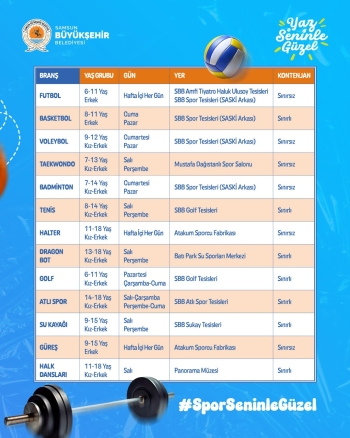 Voleybol: 9-12 yaş arası kız ve erkek çocuklara yönelik voleybol eğitimleri, cumartesi ve pazar günleri sınırsız kontenjanla yapılacak.
