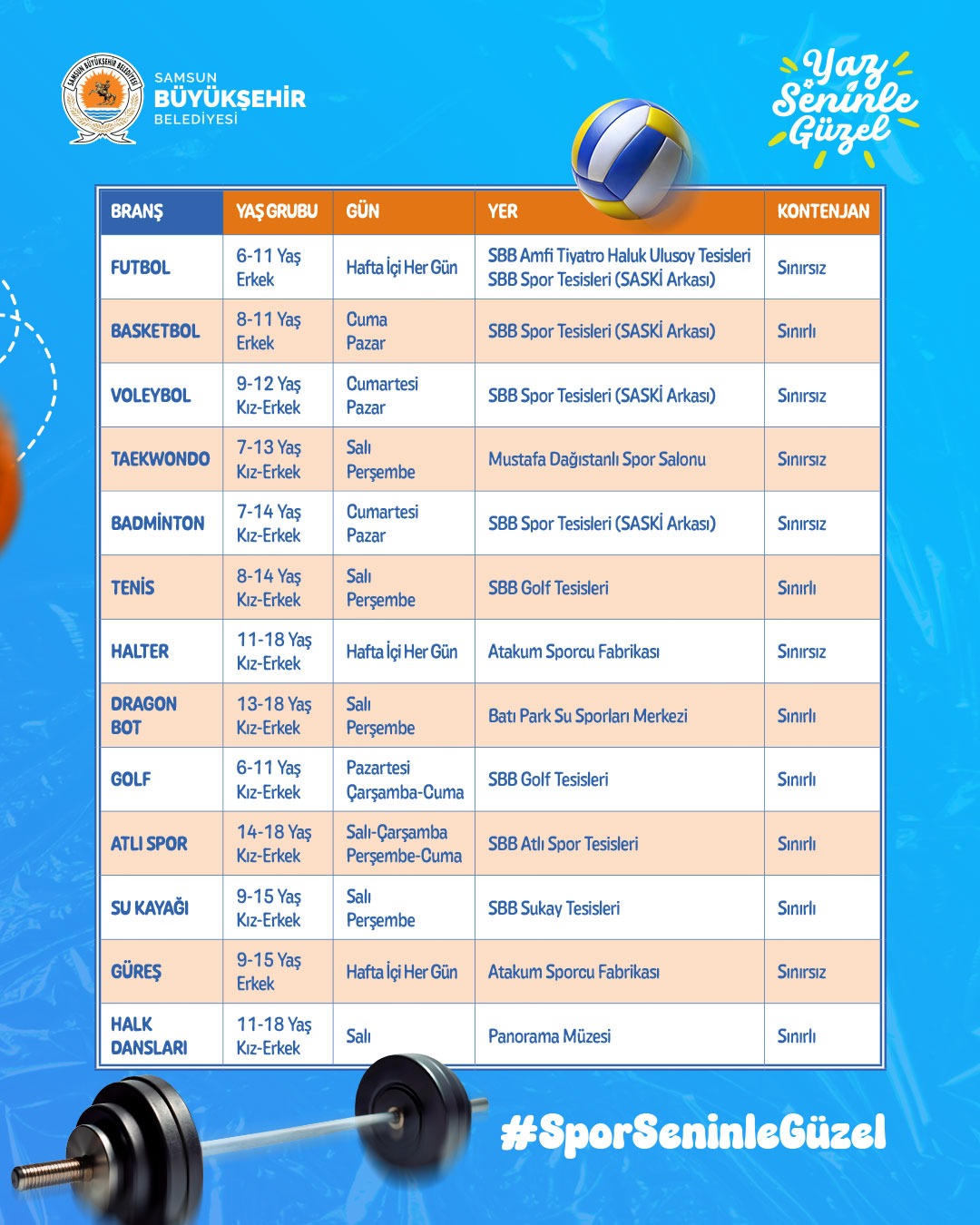 Yaz Spor Okulları kapsamında 13 farklı branşta eğitim verilecek. Programda yer alan spor dalları arasında futbol, basketbol, voleybol, taekwondo, badminton, tenis, halter, dragon bot, golf, atlı spor, su kayağı, güreş ve halk dansları yer alıyor. Yaz Spor Okulları'nda sunulan branşlara ve yaş gruplarına göre belirlenen eğitim takvimi şu şekilde:
