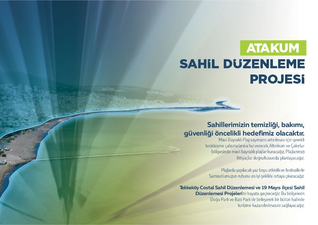 Tekkeköy Costal Sahil Düzenlemesi ve 19 Mayıs İlçesi Sahil Düzenlemesi Projeleri’ni hayata geçireceğiz.Bu bölgelerin Doğu Park ve Batı Park ile birleşerek bir bütün halinde turizme kazandırılmasını sağlayacağız.