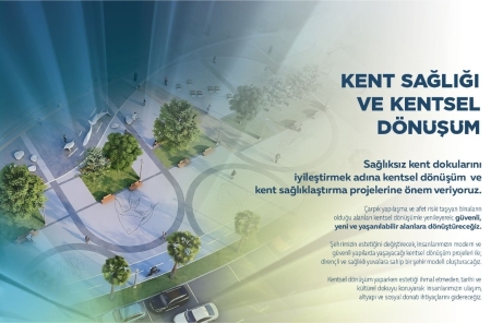 Sağlıksız kent dokularını iyileştirmek adına kentsel dönüşüm ve kent sağlıklaştırma projelerine önem veriyor, çarpık yapılaşma ve afet riski taşıyan binaların olduğu alanları kentsel dönüşümle yenileyerek; güvenli, yeni ve yaşanılabilir alanlara dönüştürmeyi hedefliyoruz.