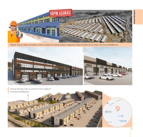 kentsel dönüşüm Gülsan Sanayi Sitesi esnafımızı, daha modern bir sanayi sitesine taşıyarak daha konforlu bir iş ortamı sunmayı hedefliyoruz. Sanayi dönüşümüyle iş yerlerinin ticari değerini artırmayı hedefliyoruz. 7